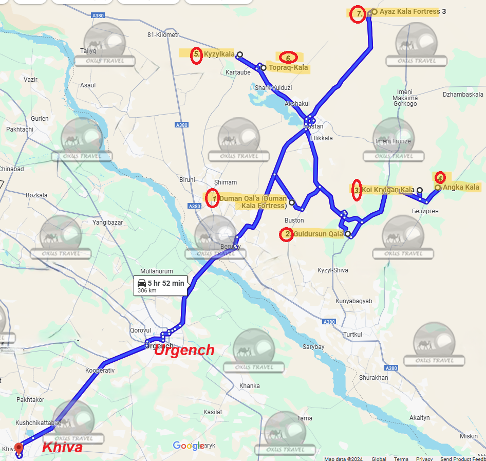 - 12.00 – visit to Angka kala [10], Kuy kyrylgan kala [11], Duman kala [12], Guldursun [13].
